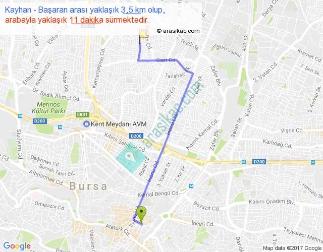 Kayhan - Başaran arası yaklaşık olarak 90 km/h ile yukarıda belirtilen sürede olup, iki yerin kuş uçuşu uzaklığı (mesafesi) 3'dir. Yolculuk otobüsle 14 dakika sürmektedir.