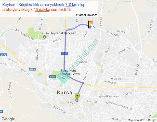 Kayhan - Küçükbalıklı arası yaklaşık olarak 90 km/h ile yukarıda belirtilen sürede olup, iki yerin kuş uçuşu uzaklığı (mesafesi) 4'dir. Yolculuk otobüsle 16 dakika sürmektedir.