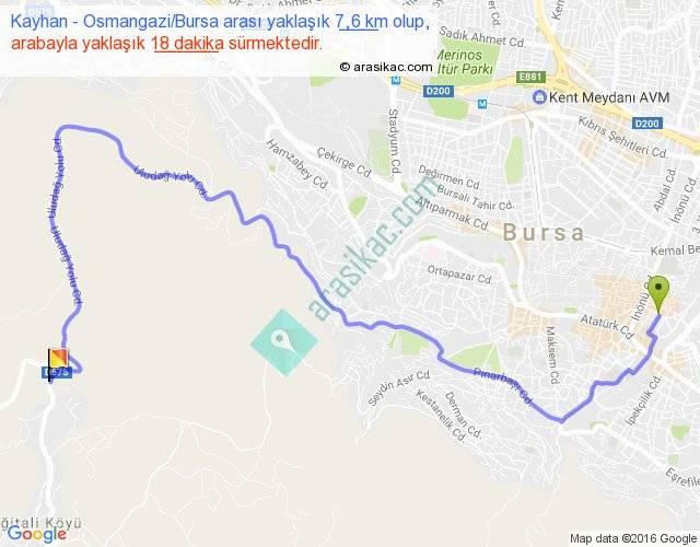 Kayhan - Osmangazi Bursa arası yaklaşık olarak 90 km/h ile yukarıda belirtilen sürede olup, iki yerin kuş uçuşu uzaklığı (mesafesi) 4'dir. Yolculuk otobüsle 23 dakika sürmektedir.