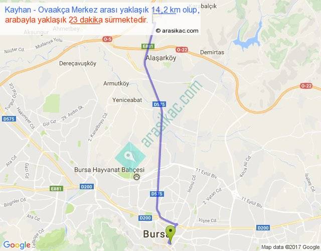 Kayhan - Ovaakça Merkez arası yaklaşık olarak 90 km/h ile yukarıda belirtilen sürede olup, iki yerin kuş uçuşu uzaklığı (mesafesi) 13'dir. Yolculuk otobüsle 29 dakika sürmektedir.
