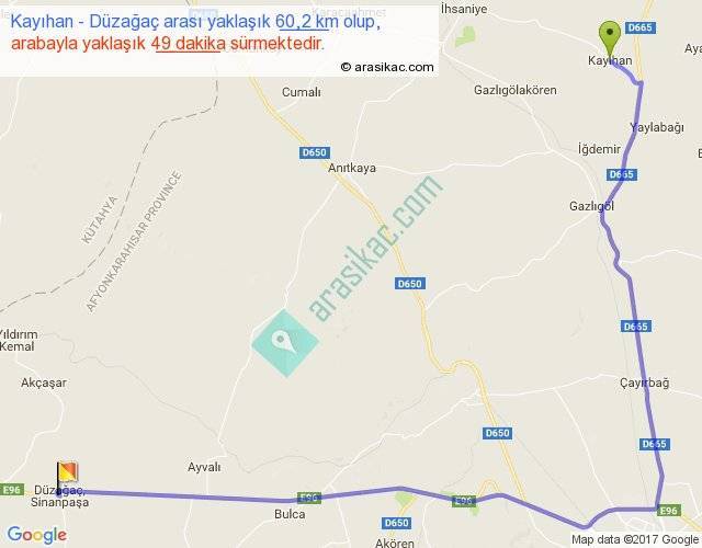 Kayıhan - Düzağaç arası yaklaşık olarak 90 km/h ile yukarıda belirtilen sürede olup, iki yerin kuş uçuşu uzaklığı (mesafesi) 38'dir. Yolculuk otobüsle 1 saat 3 dakika sürmektedir.