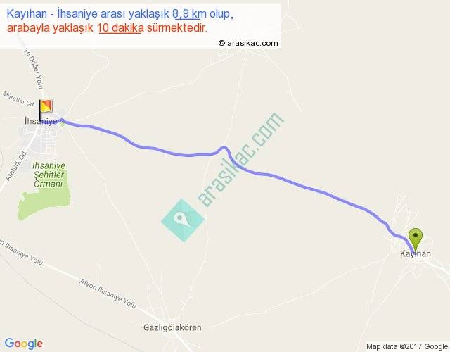 Kayıhan - İhsaniye arası yaklaşık olarak 90 km/h ile yukarıda belirtilen sürede olup, iki yerin kuş uçuşu uzaklığı (mesafesi) 8'dir. Yolculuk otobüsle 13 dakika sürmektedir.