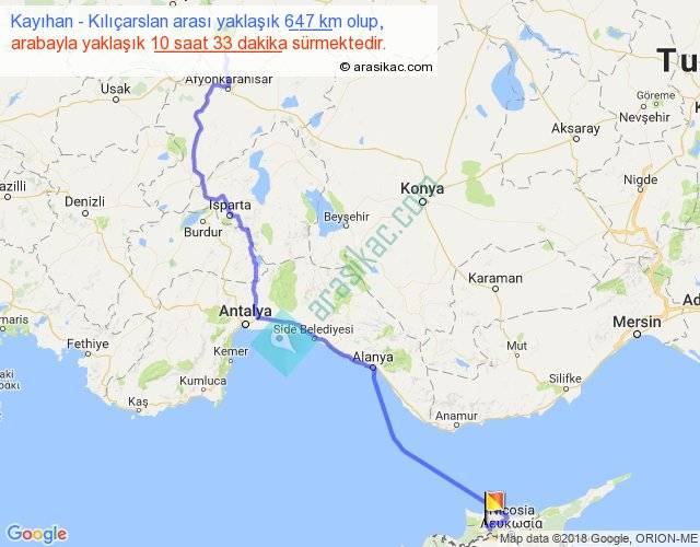 Kayıhan - Kılıçarslan arası yaklaşık olarak 90 km/h ile yukarıda belirtilen sürede olup, iki yerin kuş uçuşu uzaklığı (mesafesi) 474'dir. Eğer belirtilen yerler arasında uçak seferi var ise bu süre uçakla 43 dakika'ya kadar düşebilir. Yolculuk otobüsle 13 saat 42 dakika sürmektedir.