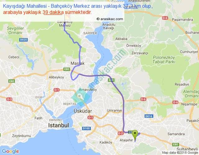 Kayışdağı Mahallesi - Bahçeköy Merkez arası yaklaşık olarak 90 km/h ile yukarıda belirtilen sürede olup, iki yerin kuş uçuşu uzaklığı (mesafesi) 25'dir. Yolculuk otobüsle 50 dakika sürmektedir.