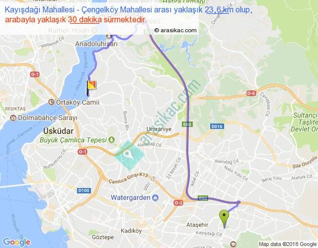 Kayışdağı Mahallesi - Çengelköy Mahallesi arası yaklaşık olarak 90 km/h ile yukarıda belirtilen sürede olup, iki yerin kuş uçuşu uzaklığı (mesafesi) 11'dir. Yolculuk otobüsle 39 dakika sürmektedir.