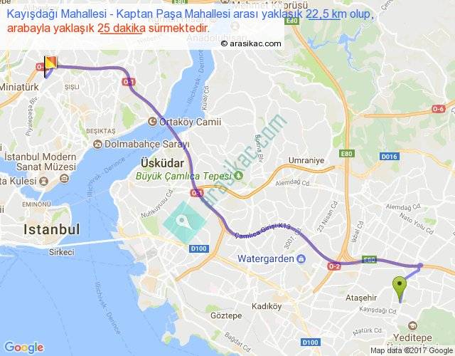 Kayışdağı Mahallesi - Kaptan Paşa Mahallesi arası yaklaşık olarak 90 km/h ile yukarıda belirtilen sürede olup, iki yerin kuş uçuşu uzaklığı (mesafesi) 17'dir. Yolculuk otobüsle 32 dakika sürmektedir.