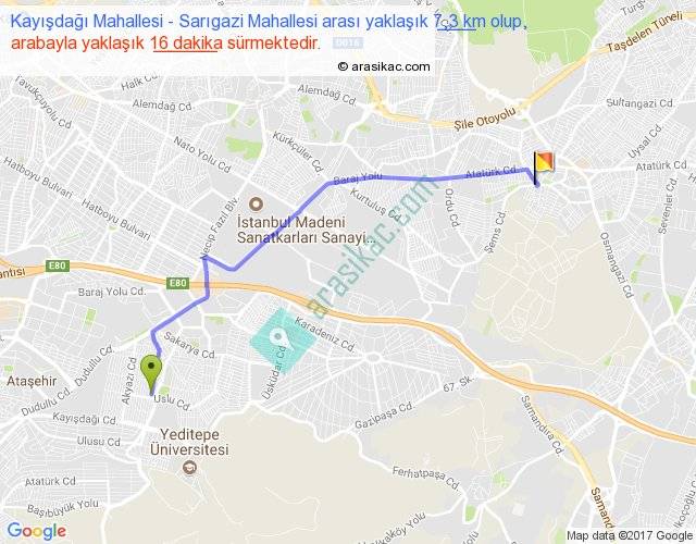 Kayışdağı Mahallesi - Sarıgazi Mahallesi arası yaklaşık olarak 90 km/h ile yukarıda belirtilen sürede olup, iki yerin kuş uçuşu uzaklığı (mesafesi) 6'dir. Yolculuk otobüsle 20 dakika sürmektedir.