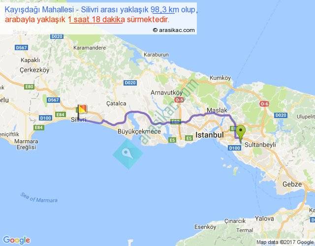 Kayışdağı Mahallesi - Silivri arası yaklaşık olarak 90 km/h ile yukarıda belirtilen sürede olup, iki yerin kuş uçuşu uzaklığı (mesafesi) 76'dir. Yolculuk otobüsle 1 saat 41 dakika sürmektedir.