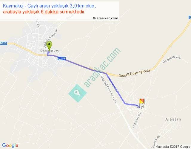 Kaymakçi - Çaylı arası yaklaşık olarak 90 km/h ile yukarıda belirtilen sürede olup, iki yerin kuş uçuşu uzaklığı (mesafesi) 3'dir. Yolculuk otobüsle 7 dakika sürmektedir.