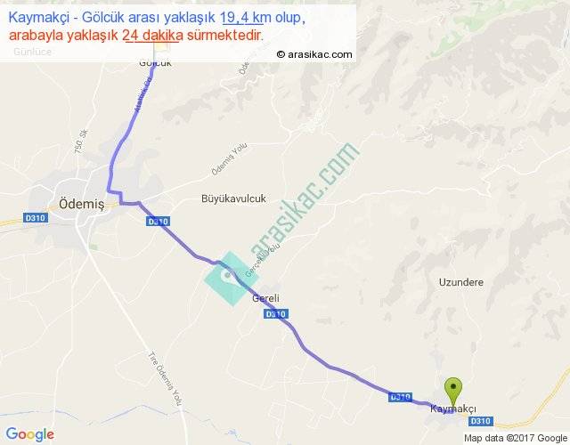 Kaymakçi - Gölcük arası yaklaşık olarak 90 km/h ile yukarıda belirtilen sürede olup, iki yerin kuş uçuşu uzaklığı (mesafesi) 15'dir. Yolculuk otobüsle 31 dakika sürmektedir.