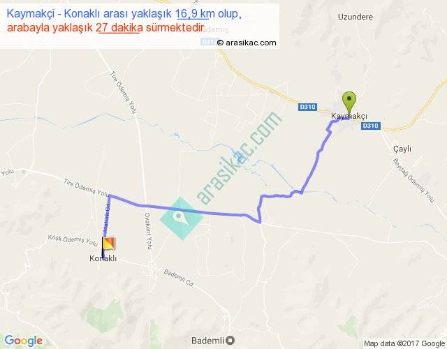 Kaymakçi - Konaklı arası yaklaşık olarak 90 km/h ile yukarıda belirtilen sürede olup, iki yerin kuş uçuşu uzaklığı (mesafesi) 12'dir. Yolculuk otobüsle 35 dakika sürmektedir.