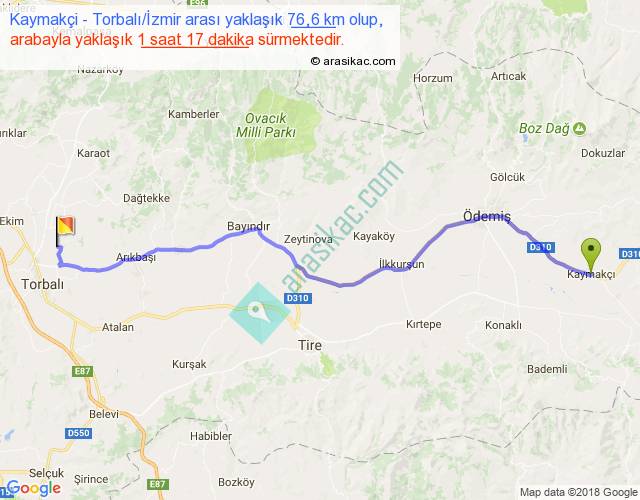 Kaymakçi - Torbalı İzmir arası yaklaşık olarak 90 km/h ile yukarıda belirtilen sürede olup, iki yerin kuş uçuşu uzaklığı (mesafesi) 64'dir. Yolculuk otobüsle 1 saat 40 dakika sürmektedir.
