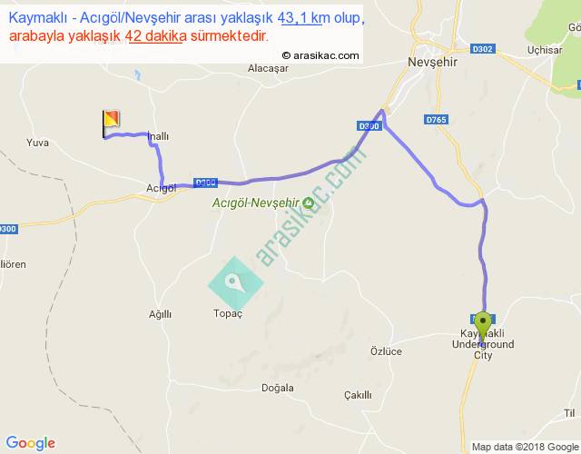Kaymaklı - Acıgöl Nevşehir arası yaklaşık olarak 90 km/h ile yukarıda belirtilen sürede olup, iki yerin kuş uçuşu uzaklığı (mesafesi) 28'dir. Yolculuk otobüsle 54 dakika sürmektedir.