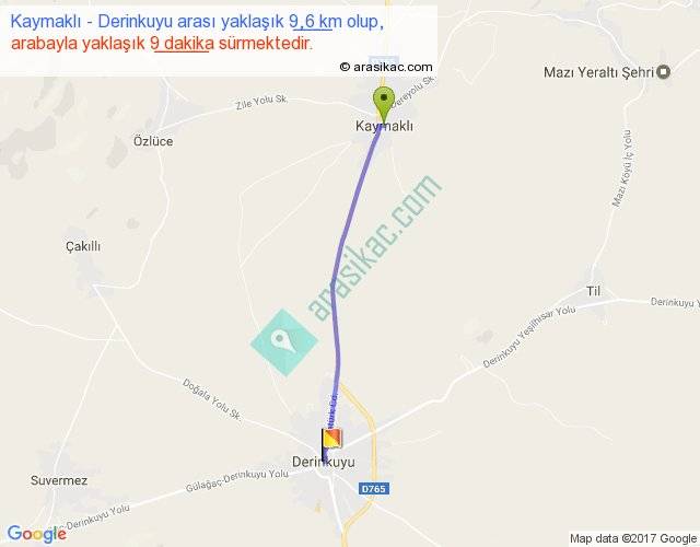 Kaymaklı - Derinkuyu arası yaklaşık olarak 90 km/h ile yukarıda belirtilen sürede olup, iki yerin kuş uçuşu uzaklığı (mesafesi) 9'dir. Yolculuk otobüsle 11 dakika sürmektedir.