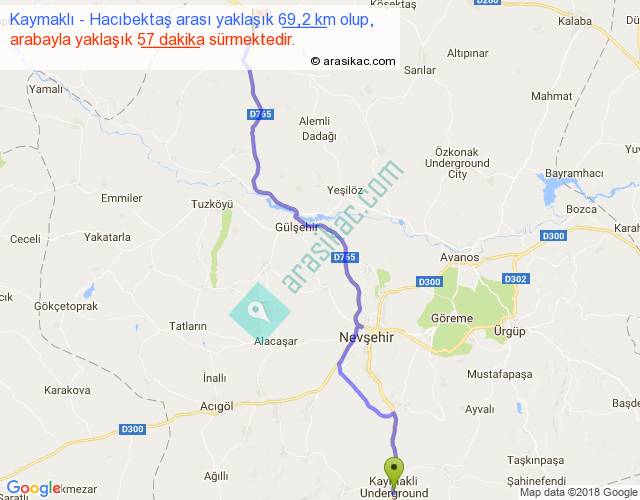 Kaymaklı - Hacıbektaş arası yaklaşık olarak 90 km/h ile yukarıda belirtilen sürede olup, iki yerin kuş uçuşu uzaklığı (mesafesi) 56'dir. Yolculuk otobüsle 1 saat 14 dakika sürmektedir.
