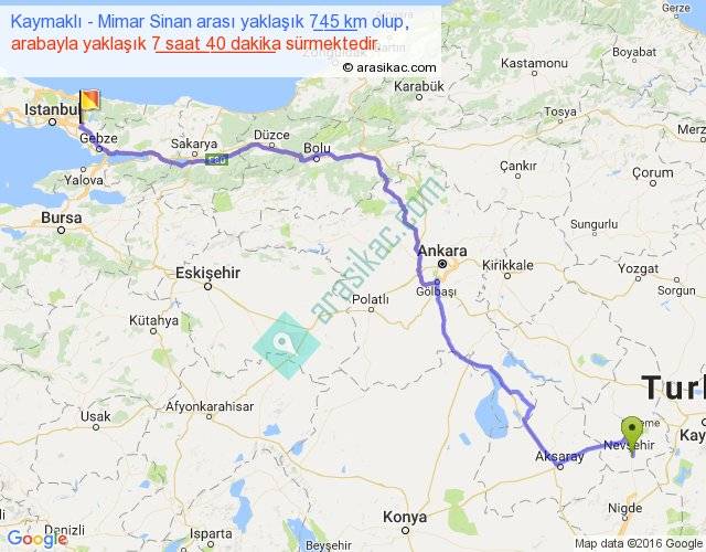 Kaymaklı - Mimar Sinan arası yaklaşık olarak 90 km/h ile yukarıda belirtilen sürede olup, iki yerin kuş uçuşu uzaklığı (mesafesi) 544'dir. Eğer belirtilen yerler arasında uçak seferi var ise bu süre uçakla 50 dakika'ya kadar düşebilir. Yolculuk otobüsle 9 saat 58 dakika sürmektedir.