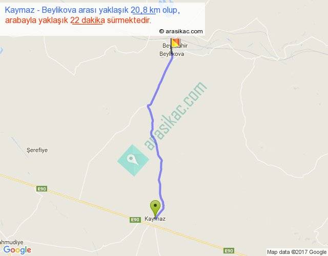 Kaymaz - Beylikova arası yaklaşık olarak 90 km/h ile yukarıda belirtilen sürede olup, iki yerin kuş uçuşu uzaklığı (mesafesi) 19'dir. Yolculuk otobüsle 28 dakika sürmektedir.