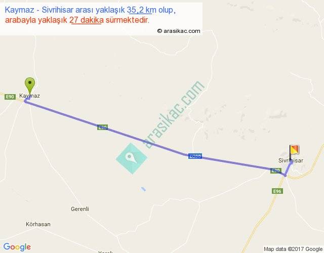 Kaymaz - Sivrihisar arası yaklaşık olarak 90 km/h ile yukarıda belirtilen sürede olup, iki yerin kuş uçuşu uzaklığı (mesafesi) 31'dir. Yolculuk otobüsle 35 dakika sürmektedir.