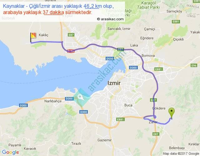 Kaynaklar - Çiğli İzmir arası yaklaşık olarak 90 km/h ile yukarıda belirtilen sürede olup, iki yerin kuş uçuşu uzaklığı (mesafesi) 31'dir. Yolculuk otobüsle 48 dakika sürmektedir.