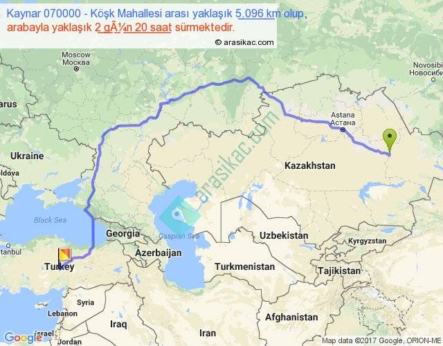 Kaynar 070000 - Köşk Mahallesi arası yaklaşık olarak 90 km/h ile yukarıda belirtilen sürede olup, iki yerin kuş uçuşu uzaklığı (mesafesi) 3476'dir. Eğer belirtilen yerler arasında uçak seferi var ise bu süre uçakla 5 saat 20 dakika'ya kadar düşebilir. Yolculuk otobüsle 3 gün 16 saat sürmektedir.