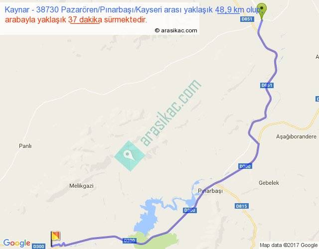 Kaynar - 38730 Pazarören Pınarbaşı Kayseri arası yaklaşık olarak 90 km/h ile yukarıda belirtilen sürede olup, iki yerin kuş uçuşu uzaklığı (mesafesi) 37'dir. Yolculuk otobüsle 48 dakika sürmektedir.