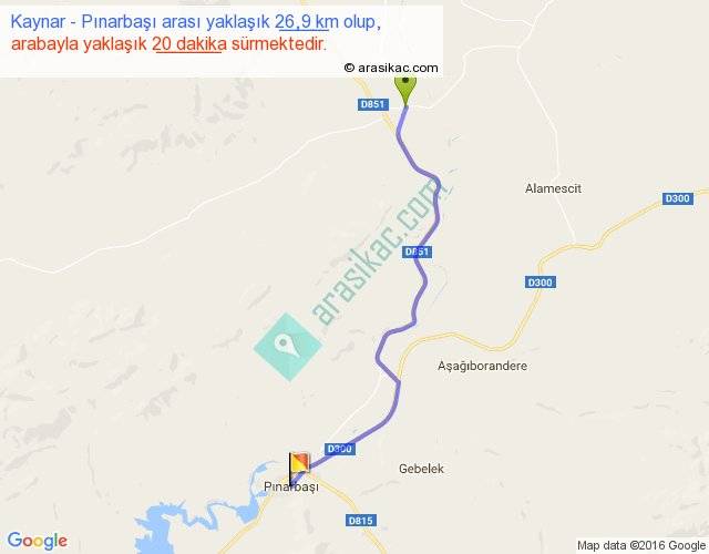 Kaynar - Pınarbaşı arası yaklaşık olarak 90 km/h ile yukarıda belirtilen sürede olup, iki yerin kuş uçuşu uzaklığı (mesafesi) 21'dir. Yolculuk otobüsle 26 dakika sürmektedir.