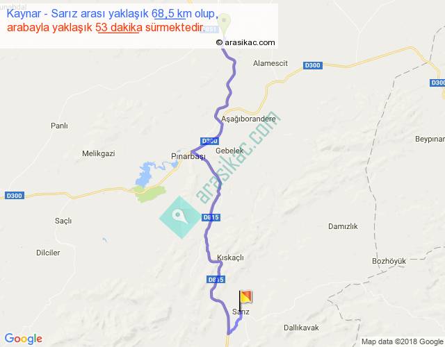 Kaynar - Sarız arası yaklaşık olarak 90 km/h ile yukarıda belirtilen sürede olup, iki yerin kuş uçuşu uzaklığı (mesafesi) 47'dir. Yolculuk otobüsle 1 saat 8 dakika sürmektedir.