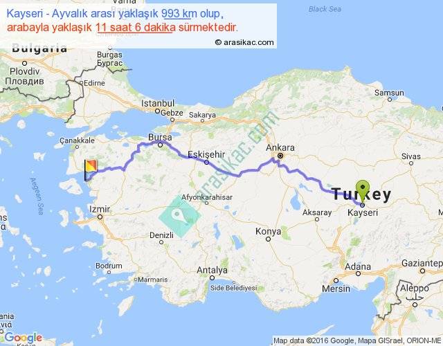 Kayseri - Ayvalık arası yaklaşık olarak 90 km/h ile yukarıda belirtilen sürede olup, iki yerin kuş uçuşu uzaklığı (mesafesi) 758'dir. Eğer belirtilen yerler arasında uçak seferi var ise bu süre uçakla 1 saat 09 dakika'ya kadar düşebilir. Yolculuk otobüsle 14 saat 25 dakika sürmektedir.