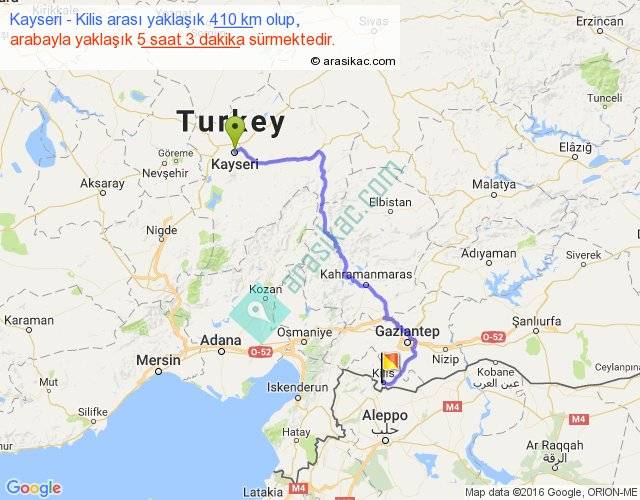 Kayseri - Kilis arası yaklaşık olarak 90 km/h ile yukarıda belirtilen sürede olup, iki yerin kuş uçuşu uzaklığı (mesafesi) 264'dir. Eğer belirtilen yerler arasında uçak seferi var ise bu süre uçakla 24 dakika'ya kadar düşebilir. Yolculuk otobüsle 6 saat 33 dakika sürmektedir.