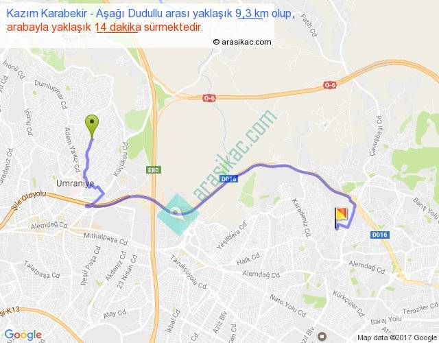 Kazım Karabekir - Aşağı Dudullu arası yaklaşık olarak 90 km/h ile yukarıda belirtilen sürede olup, iki yerin kuş uçuşu uzaklığı (mesafesi) 5'dir. Yolculuk otobüsle 18 dakika sürmektedir.