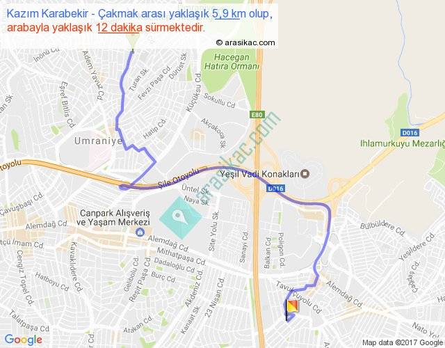 Kazım Karabekir - Çakmak arası yaklaşık olarak 90 km/h ile yukarıda belirtilen sürede olup, iki yerin kuş uçuşu uzaklığı (mesafesi) 3'dir. Yolculuk otobüsle 15 dakika sürmektedir.