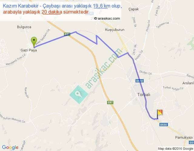 Kazım Karabekir - Çaybaşı arası yaklaşık olarak 90 km/h ile yukarıda belirtilen sürede olup, iki yerin kuş uçuşu uzaklığı (mesafesi) 14'dir. Yolculuk otobüsle 26 dakika sürmektedir.