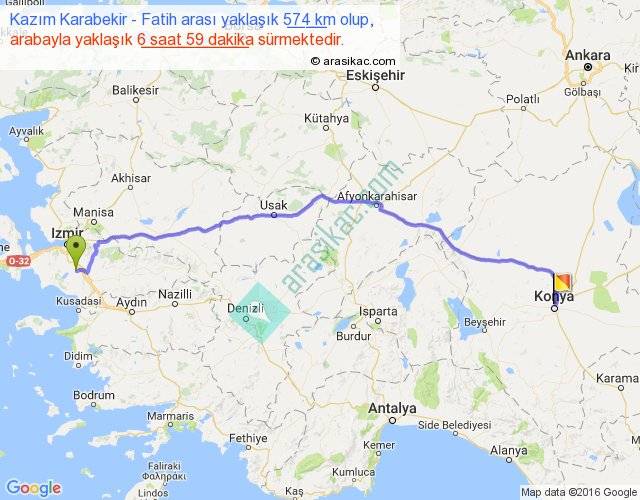 Kazım Karabekir - Fatih arası yaklaşık olarak 90 km/h ile yukarıda belirtilen sürede olup, iki yerin kuş uçuşu uzaklığı (mesafesi) 459'dir. Eğer belirtilen yerler arasında uçak seferi var ise bu süre uçakla 42 dakika'ya kadar düşebilir. Yolculuk otobüsle 9 saat 4 dakika sürmektedir.