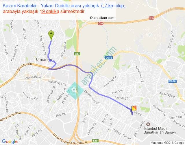 Kazım Karabekir - Yukarı Dudullu arası yaklaşık olarak 90 km/h ile yukarıda belirtilen sürede olup, iki yerin kuş uçuşu uzaklığı (mesafesi) 5'dir. Yolculuk otobüsle 24 dakika sürmektedir.