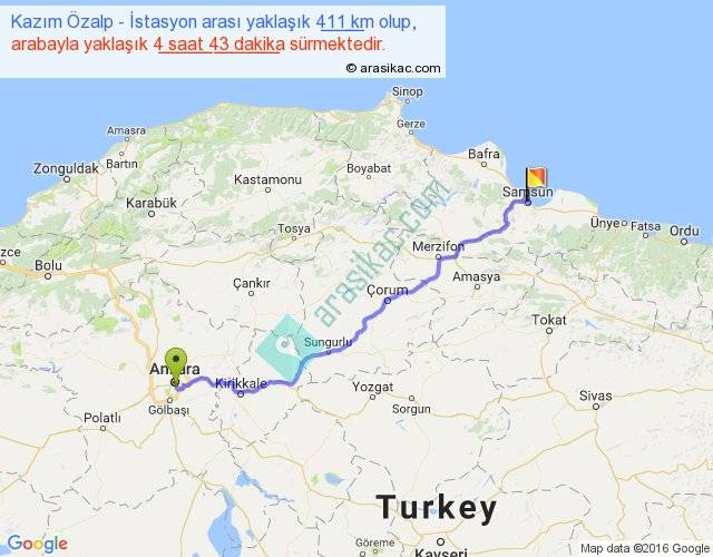 Kazım Özalp - İstasyon arası yaklaşık olarak 90 km/h ile yukarıda belirtilen sürede olup, iki yerin kuş uçuşu uzaklığı (mesafesi) 329'dir. Eğer belirtilen yerler arasında uçak seferi var ise bu süre uçakla 30 dakika'ya kadar düşebilir. Yolculuk otobüsle 6 saat 7 dakika sürmektedir.