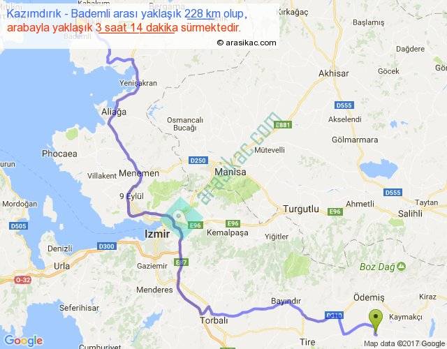 Kazımdırık - Bademli arası yaklaşık olarak 90 km/h ile yukarıda belirtilen sürede olup, iki yerin kuş uçuşu uzaklığı (mesafesi) 144'dir. Yolculuk otobüsle 4 saat 12 dakika sürmektedir.