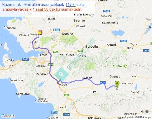 Kazımdırık - Emiralem arası yaklaşık olarak 90 km/h ile yukarıda belirtilen sürede olup, iki yerin kuş uçuşu uzaklığı (mesafesi) 95'dir. Yolculuk otobüsle 2 saat 33 dakika sürmektedir.