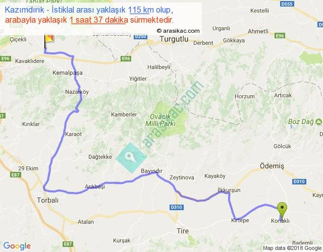 Kazımdırık - İstiklal arası yaklaşık olarak 90 km/h ile yukarıda belirtilen sürede olup, iki yerin kuş uçuşu uzaklığı (mesafesi) 69'dir. Yolculuk otobüsle 2 saat 6 dakika sürmektedir.