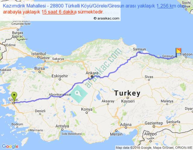 Kazımdirik Mahallesi - 28800 Türkelli Köyü Görele Giresun arası yaklaşık olarak 90 km/h ile yukarıda belirtilen sürede olup, iki yerin kuş uçuşu uzaklığı (mesafesi) 1043'dir. Eğer belirtilen yerler arasında uçak seferi var ise bu süre uçakla 1 saat 36 dakika'ya kadar düşebilir. Yolculuk otobüsle 19 saat 37 dakika sürmektedir.