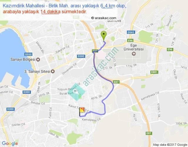 Kazımdirik Mahallesi - Birlik Mah. arası yaklaşık olarak 90 km/h ile yukarıda belirtilen sürede olup, iki yerin kuş uçuşu uzaklığı (mesafesi) 4'dir. Yolculuk otobüsle 18 dakika sürmektedir.