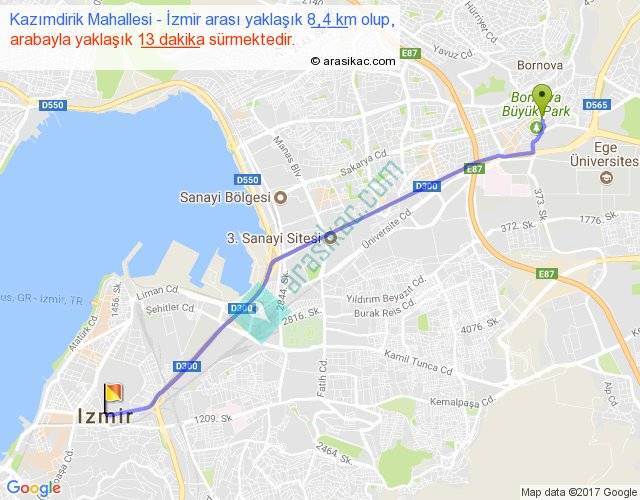 Kazımdirik Mahallesi - İzmir arası yaklaşık olarak 90 km/h ile yukarıda belirtilen sürede olup, iki yerin kuş uçuşu uzaklığı (mesafesi) 8'dir. Yolculuk otobüsle 16 dakika sürmektedir.