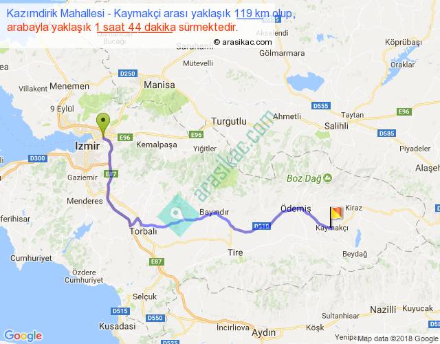 Kazımdirik Mahallesi - Kaymakçi arası yaklaşık olarak 90 km/h ile yukarıda belirtilen sürede olup, iki yerin kuş uçuşu uzaklığı (mesafesi) 85'dir. Yolculuk otobüsle 2 saat 15 dakika sürmektedir.