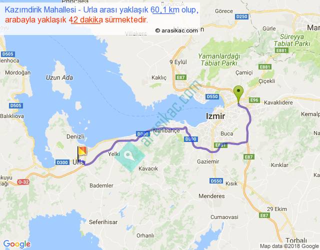 Kazımdirik Mahallesi - Urla arası yaklaşık olarak 90 km/h ile yukarıda belirtilen sürede olup, iki yerin kuş uçuşu uzaklığı (mesafesi) 40'dir. Yolculuk otobüsle 54 dakika sürmektedir.
