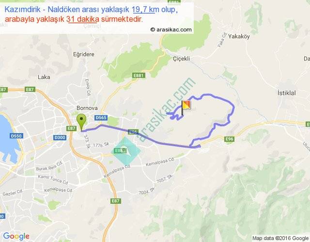 Kazımdirik - Naldöken arası yaklaşık olarak 90 km/h ile yukarıda belirtilen sürede olup, iki yerin kuş uçuşu uzaklığı (mesafesi) 6'dir. Yolculuk otobüsle 40 dakika sürmektedir.