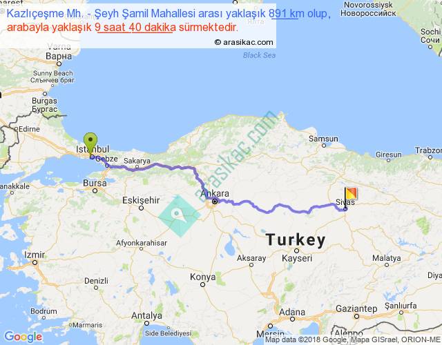 Kazlıçeşme Mh. - Şeyh Şamil Mahallesi arası yaklaşık olarak 90 km/h ile yukarıda belirtilen sürede olup, iki yerin kuş uçuşu uzaklığı (mesafesi) 698'dir. Eğer belirtilen yerler arasında uçak seferi var ise bu süre uçakla 1 saat 04 dakika'ya kadar düşebilir. Yolculuk otobüsle 12 saat 34 dakika sürmektedir.
