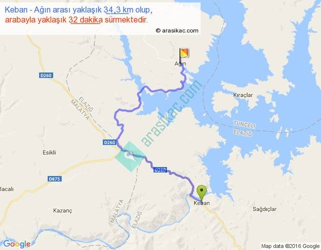 Keban - Ağın arası yaklaşık olarak 90 km/h ile yukarıda belirtilen sürede olup, iki yerin kuş uçuşu uzaklığı (mesafesi) 17'dir. Yolculuk otobüsle 41 dakika sürmektedir.