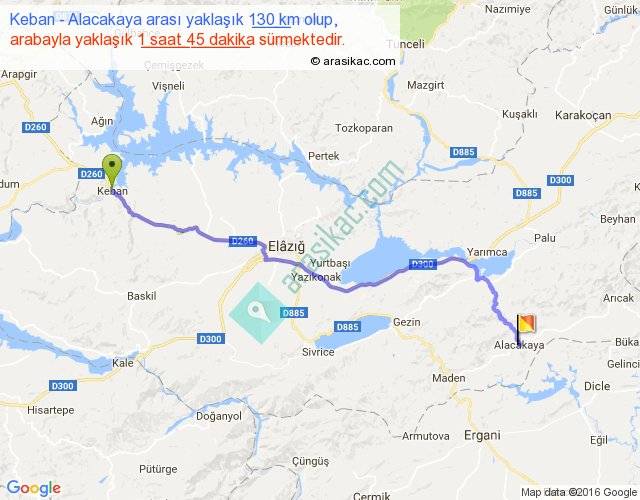 Keban - Alacakaya arası yaklaşık olarak 90 km/h ile yukarıda belirtilen sürede olup, iki yerin kuş uçuşu uzaklığı (mesafesi) 103'dir. Yolculuk otobüsle 2 saat 16 dakika sürmektedir.
