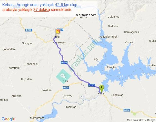 Keban - Arapgir arası yaklaşık olarak 90 km/h ile yukarıda belirtilen sürede olup, iki yerin kuş uçuşu uzaklığı (mesafesi) 35'dir. Yolculuk otobüsle 48 dakika sürmektedir.