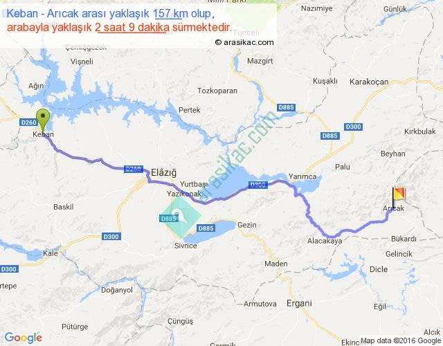 Keban - Arıcak arası yaklaşık olarak 90 km/h ile yukarıda belirtilen sürede olup, iki yerin kuş uçuşu uzaklığı (mesafesi) 123'dir. Yolculuk otobüsle 2 saat 47 dakika sürmektedir.