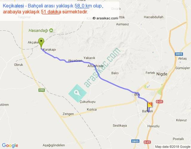 Keçikalesi - Bahçeli arası yaklaşık olarak 90 km/h ile yukarıda belirtilen sürede olup, iki yerin kuş uçuşu uzaklığı (mesafesi) 50'dir. Yolculuk otobüsle 1 saat 6 dakika sürmektedir.